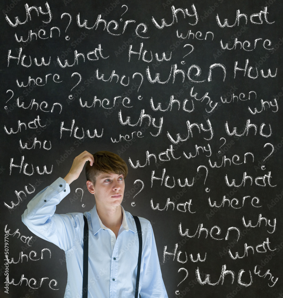 Thinking business man questions what why when where who and how