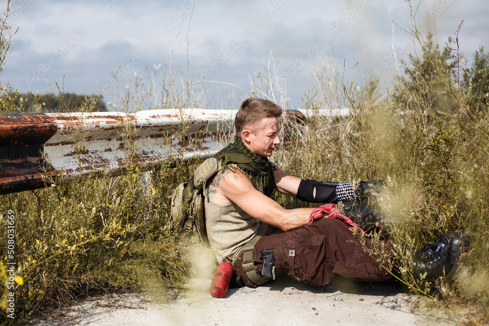 vandal man in dirty clothes sits on an abandoned grassy road, on a bridge