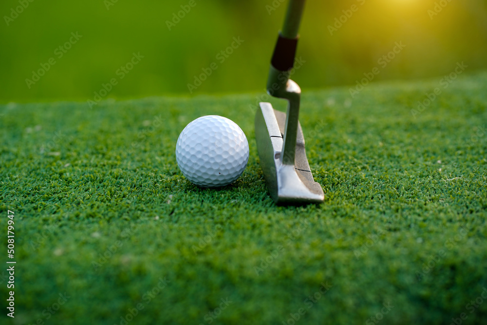 Golf clubs and golf balls on a green lawn in a beautiful golf course with morning sunshine.