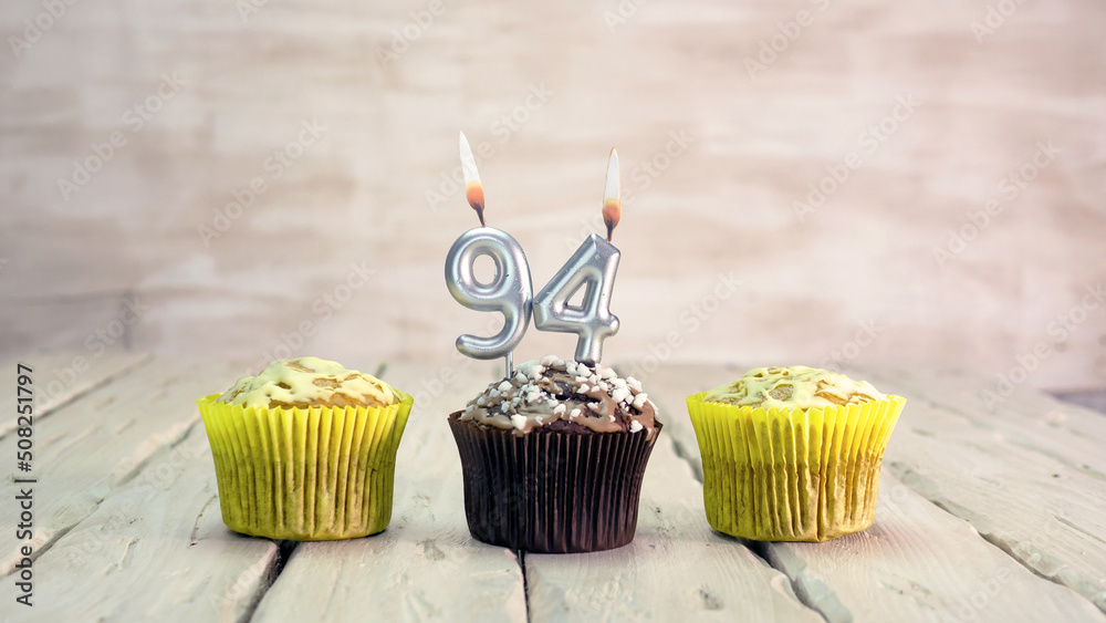 Happy birthday muffins with candles with the number 94. Card copy space with pies for congratulations.