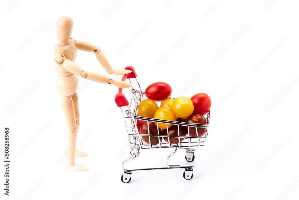 Dummy pushing a shopping cart with colorful cherry tomatoes on a white background. Shopping concept