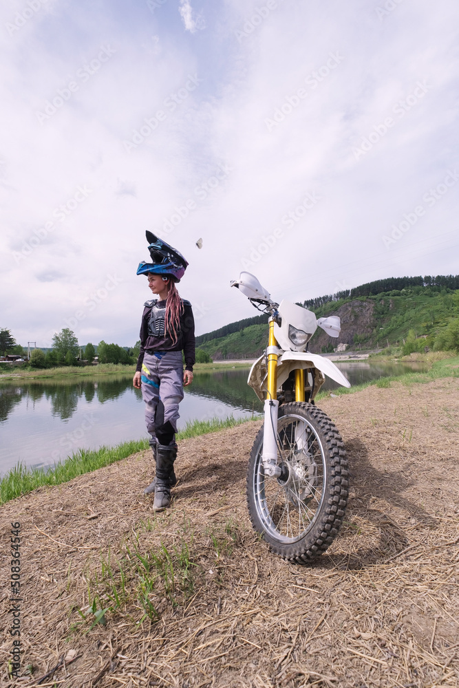 Beautiful female motorcyclist wearing helmet and pink dreadlocks walking along river next to her dirt motorcycle. Vertical photo