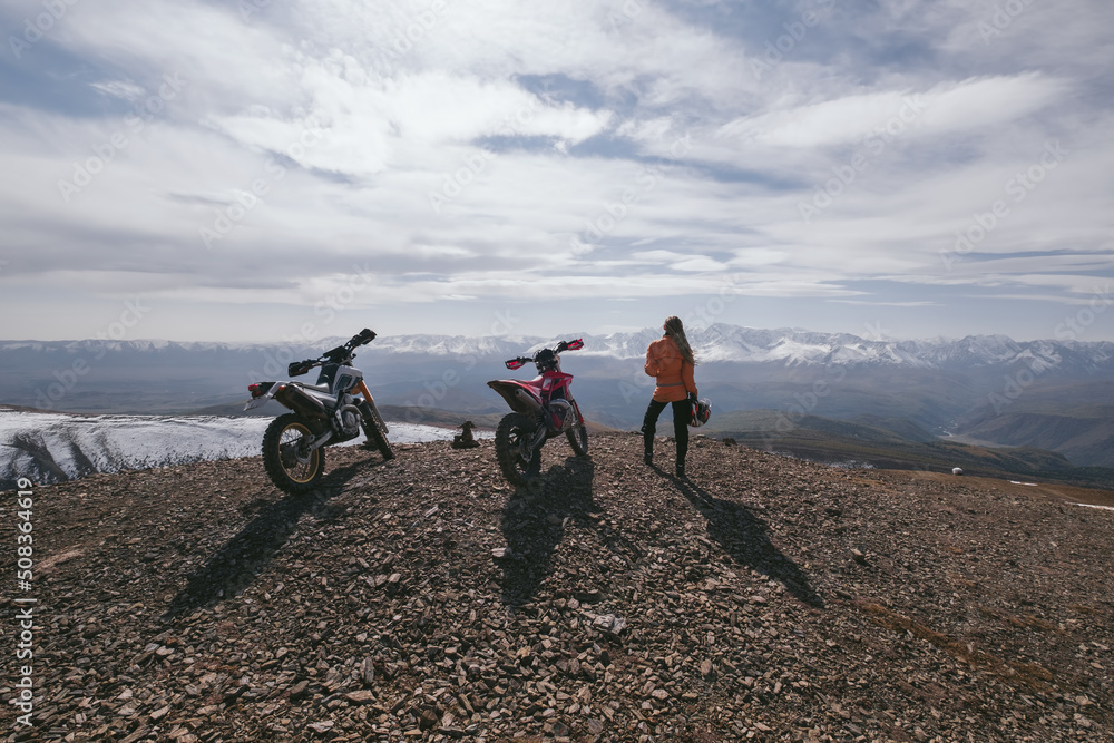 Female motorcyclist holding helmet standing with her enduro motorcycle on mountain top, snow peaks skyline view