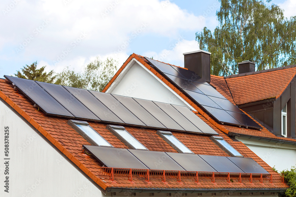 Solar panels on Roof of House. Eco House with Solar Panels on Tiled Roof. Solar System on Private Building.