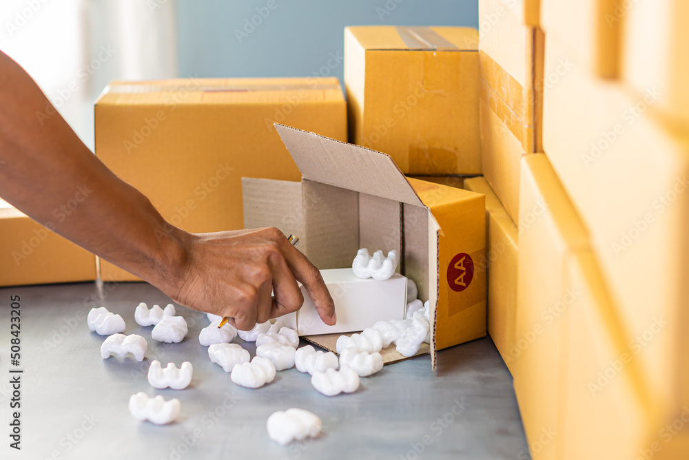 Male business owner working, packing the order for shipping to customer. Female entrepreneur packaging box for delivery. Ecommerce drop shipping shipment service concept.