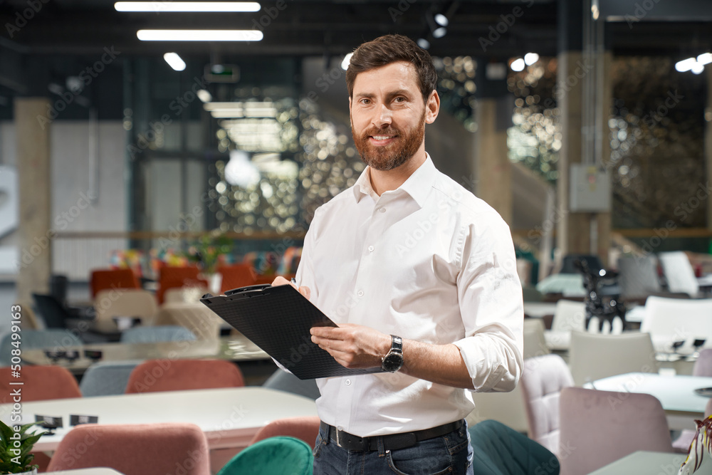 Front view of brunette male with beard standing, holding folder in furniture store. Designer, seller, architect writing, designing, looking at camera. Concept of furniture.