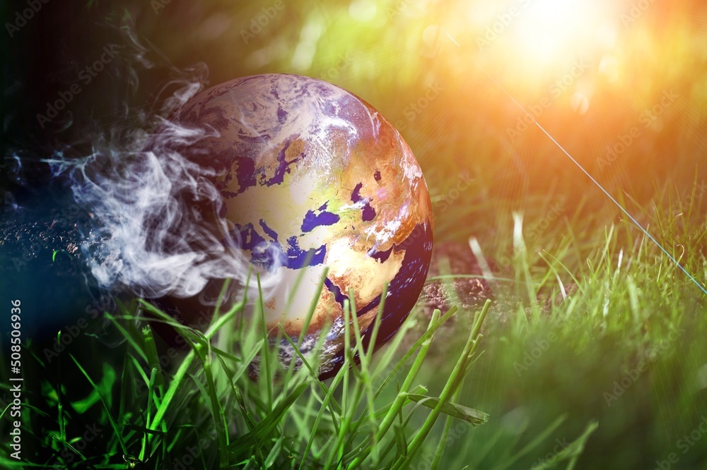 Earth planet globe with smoke on grass. Bad climate concept. overabundance CO2 on Earth. Elements by NASA.