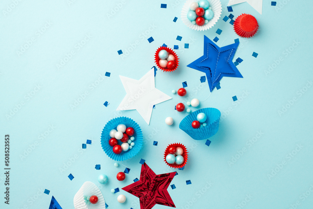 USA Independence Day concept. Top view photo of blue red and white stars confetti and paper backing molds with candies on isolated pastel blue background