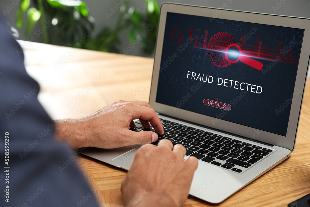 Fraud prevention security system. Man using laptop at wooden table, closeup