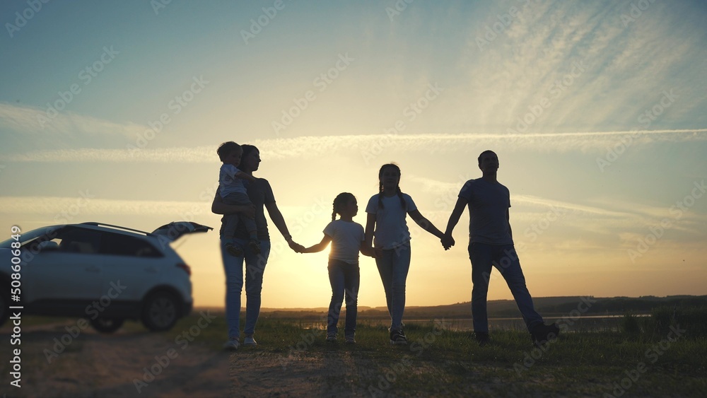 people in the park. happy family a silhouette walk at sunset. car travel kid dream concept. happy family parents and children walk silhouette next to car. family walk next to sun car