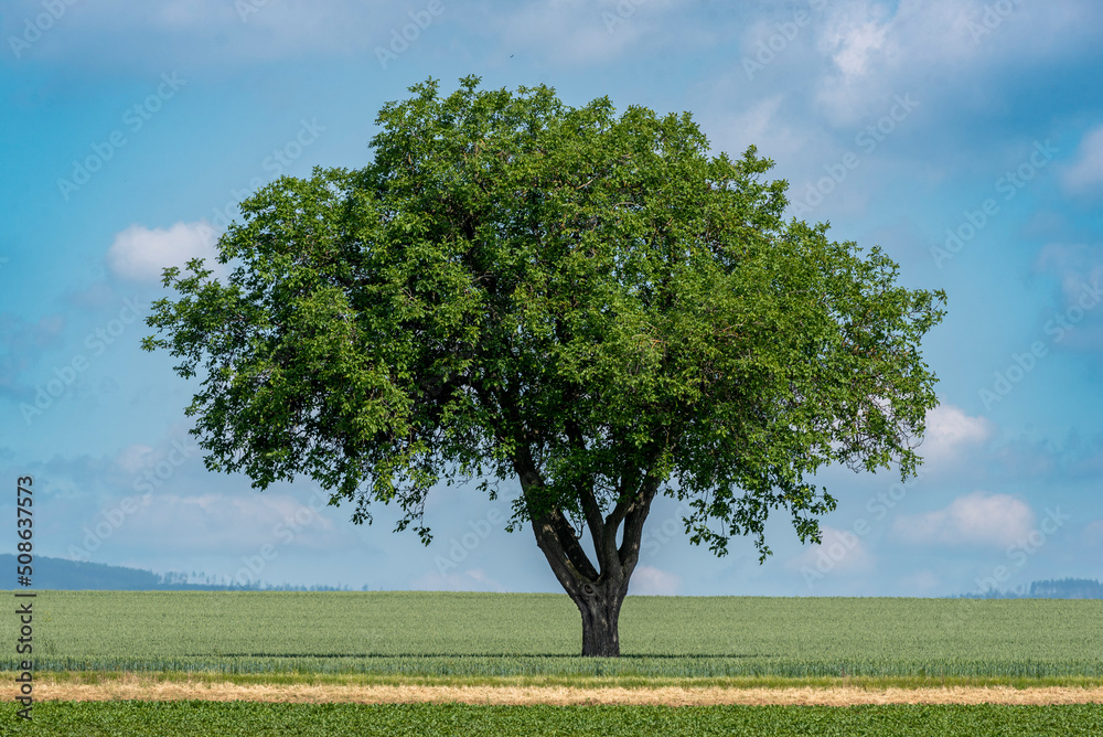 Teleaufnahme eines alleinstehenden Walnussbaums auf einem landwirtschaftlich genutzten Feld