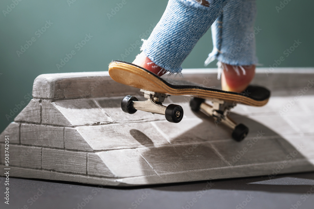 A man performs exercises on a fingerboard, rides on a plaster ramp