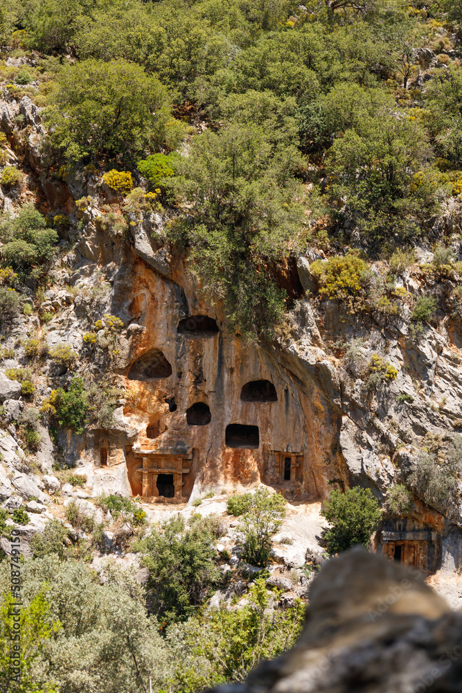 Archaeological remains of the Lycian rock cut tombs. Lycian Tombs. Unique ancient necropolis. Ancient Greek burials. Tourism and attractions. The ancient Greek city of Pinara, Turkey