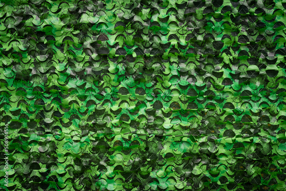 Military camouflage mesh texture background. Dark, brown and green material surface backdrop. Army style camo netting for camping, fishing and hunting. Hiding, staying safe in the forest. Copy space