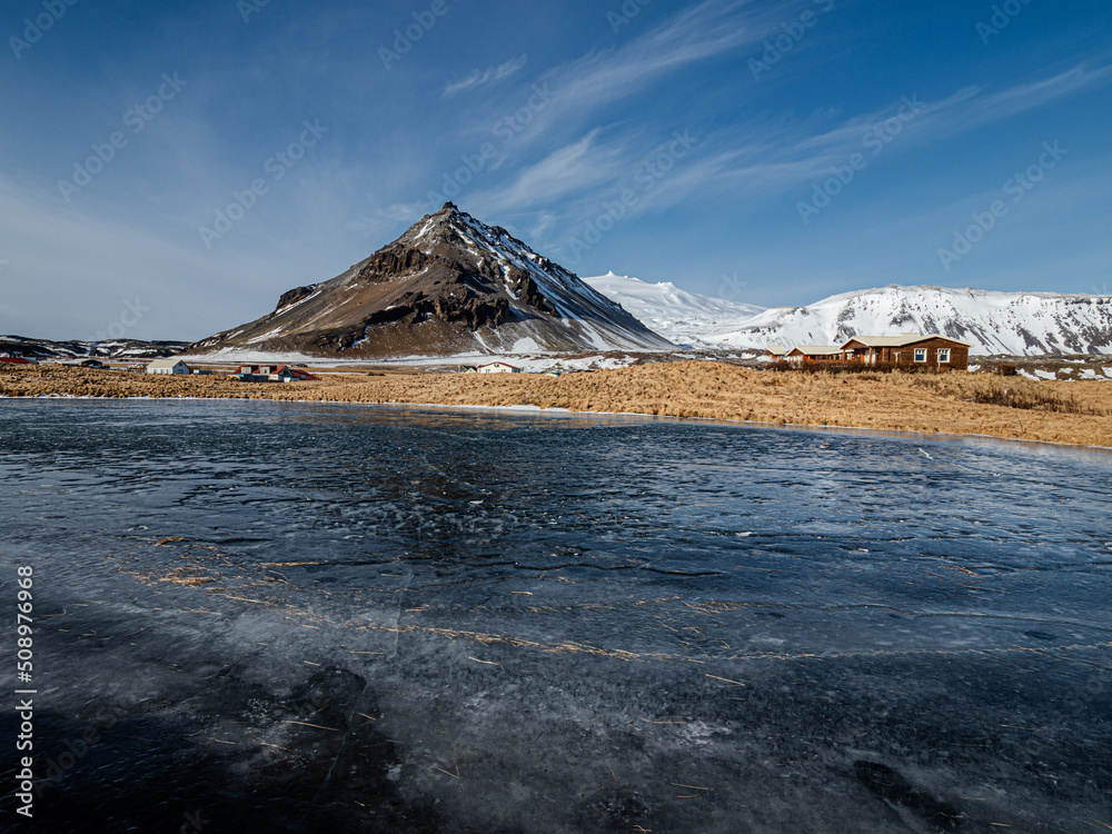 Mount Stapafell at Arnarstapi west Iceland above a frozen lake.