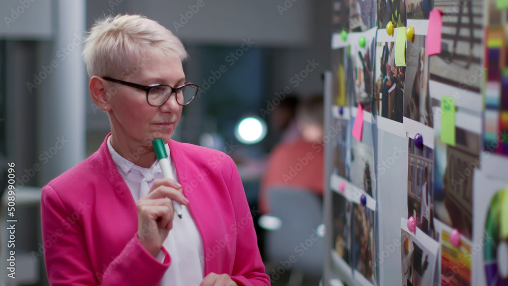 Creative mature woman write notes on board with pictures and notes working in fashion magazine