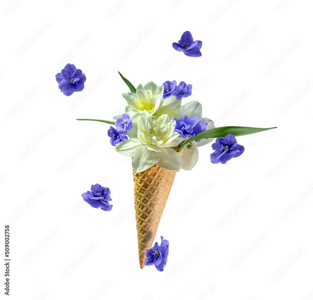 White daffodil and violet flowers in ice-cream isolated on white