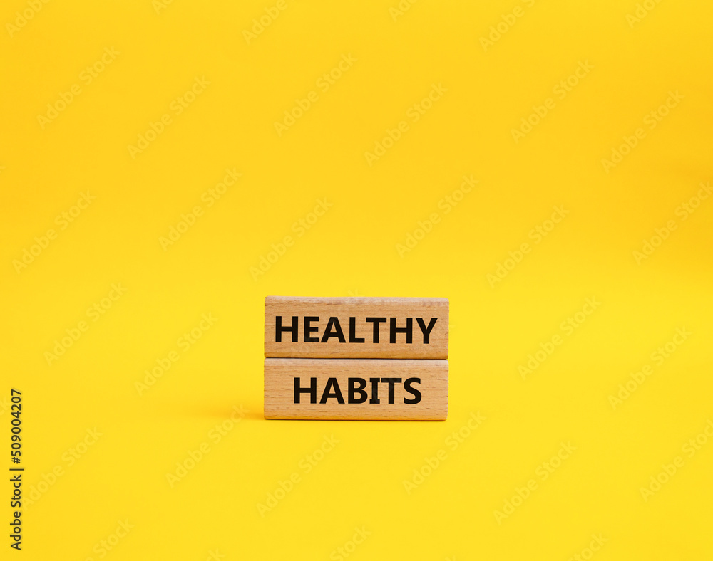 Healthy habits symbol. Concept word Healthy habits on wooden blocks. Beautiful yellow background. Business and Healthy habits concept. Copy space