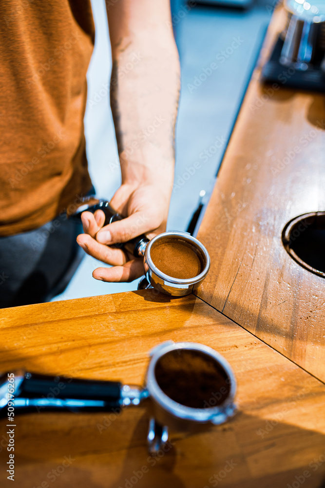 Barista is preparing and pressing coffee with portafilter.