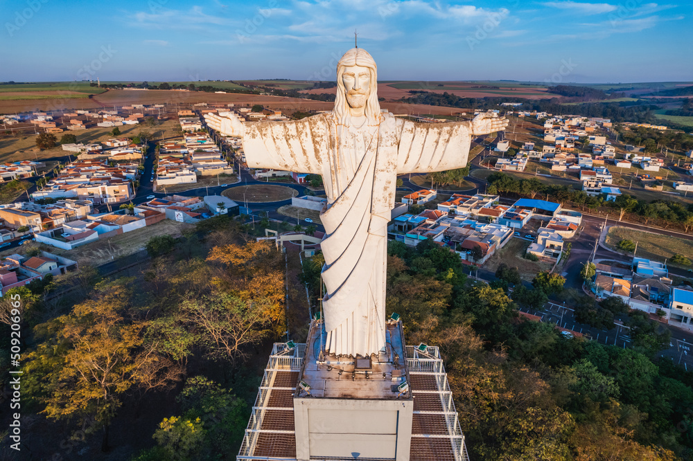 Sertaozinho, São Paulo / Brazil - Circa june 2022: Aerial image of the city of Sertaozinho, SP. Christ the Redeemer monument of the city, way of faith.