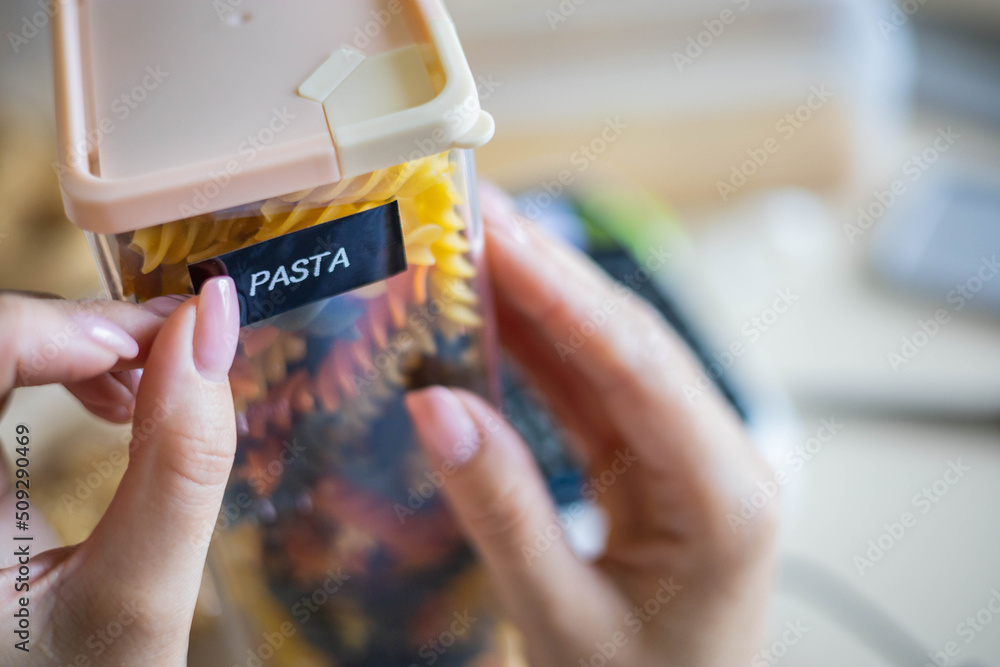 Closeup female hands sticking label on plastic package pasta. Storage organization of food products