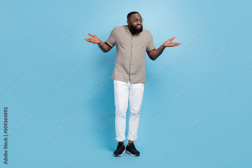 Full body portrait of uncertain clueless person shrug shoulders isolated on blue color background