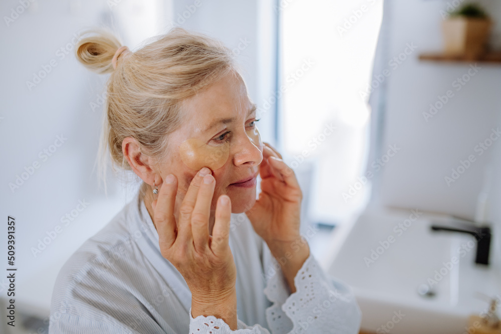 Beautiful senior woman in bathrobe, applying eye patches for puffiness while looking in the mirror