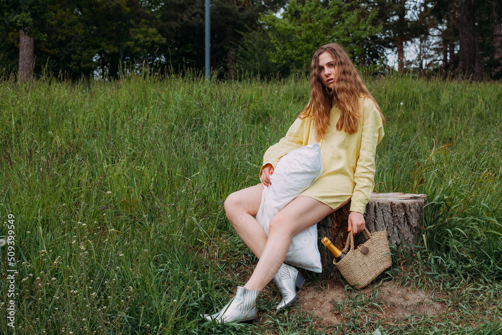 A young slender girl in a yellow shirt sits on a stump in the park, holds a pillow and a basket with a bottle of champagne in her hands, rests.