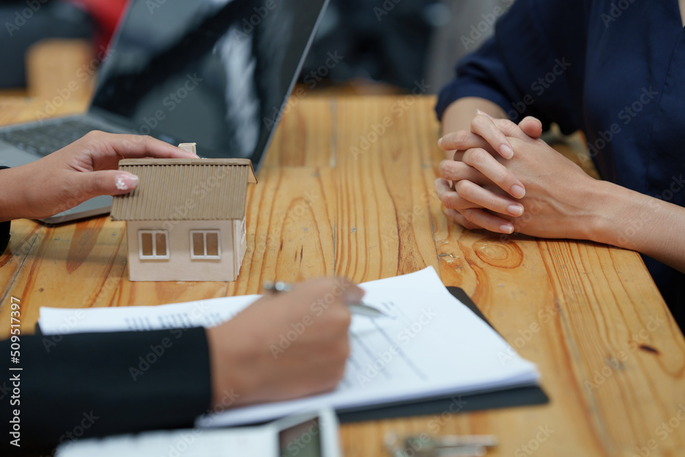 Business woman explain before signing agreement contract for buying house. Bank manager concept.