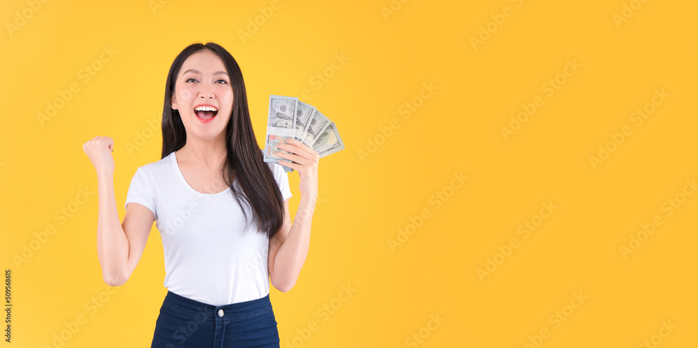 US dollars money in hand, happy pretty asian female showing a lot money in her hands winner successful in business bankruptcy economic financial concept.