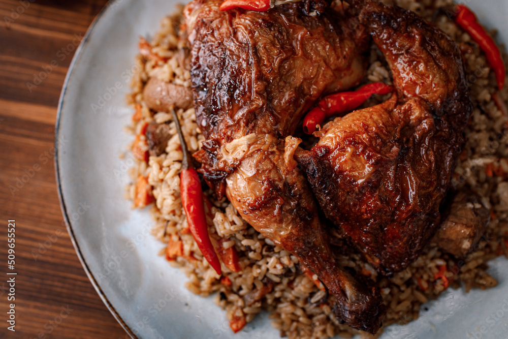 Kabsa close-up, rice and meat dish, saudi arabia national traditional food. Muslim family dinner, Ramadan, iftar. Arabian cuisine. Religious holiday, holy month.