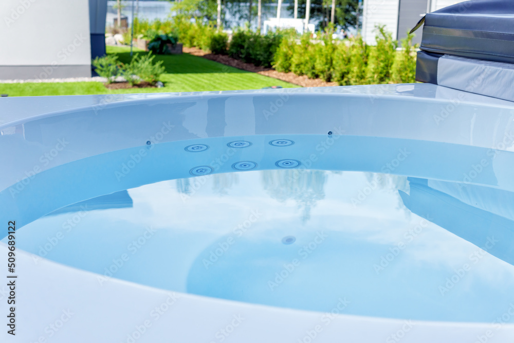 A hot tub in a terrace with a beautiful lake view. A well-kept garden on a beautiful summer's day. House exterior.