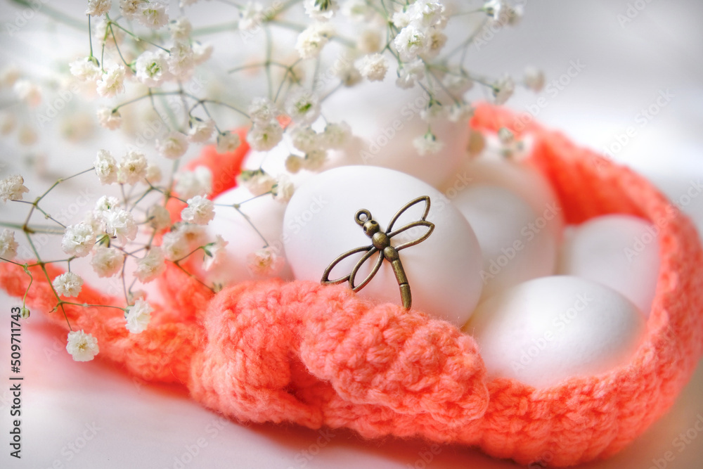 Spring Easter still life. Chicken white eggs in crochet basket with spring flowers on white background