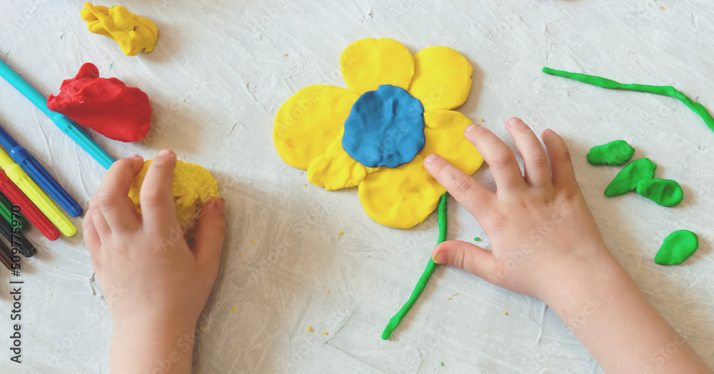 Hands of little girl making flower and sun and other from colorful clay dough, plasticine, Home Education game with clay. Early development concept. Educational and entertaining classes with children