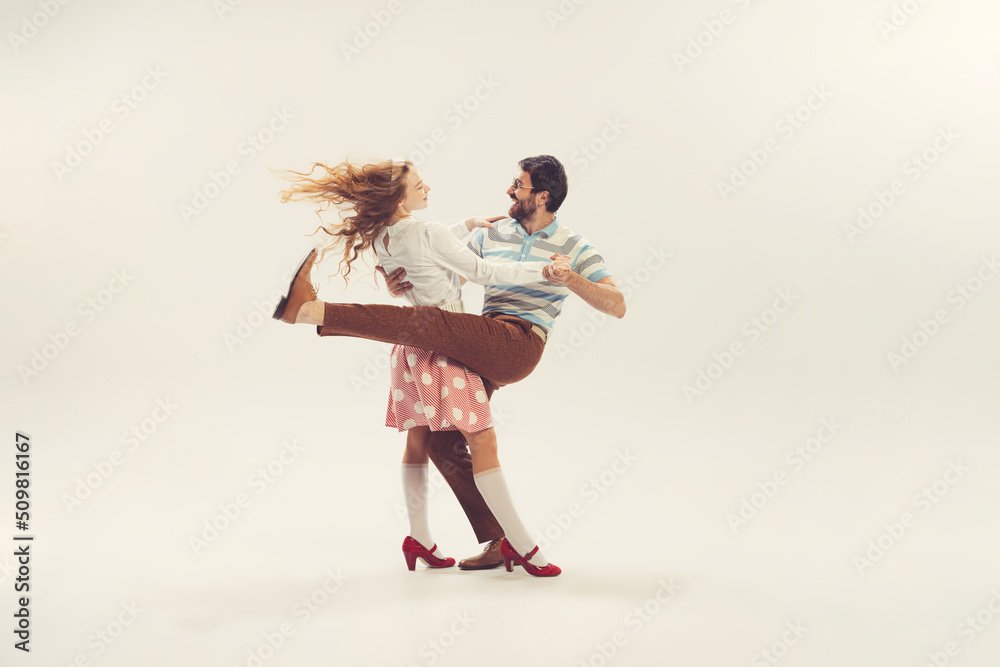 Young man and woman in vintage retro style outfits dancing social dance isolated on white background. Timeless traditions, 1960s american fashion style and art.
