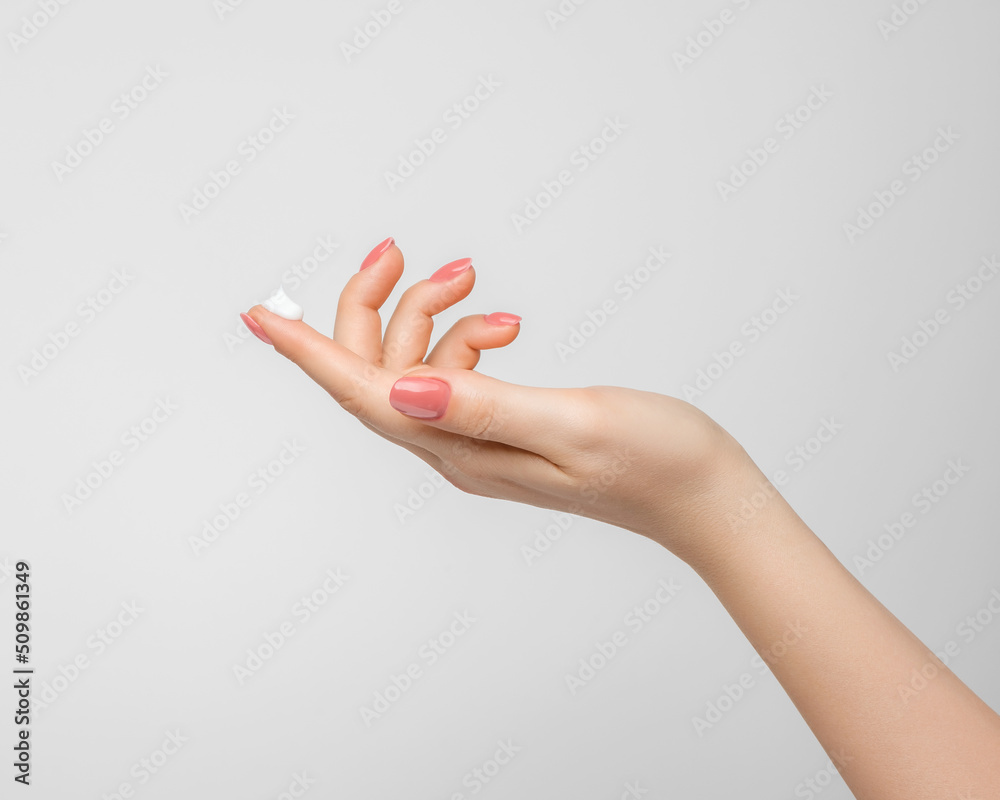 A drop of thick white hand cream on the finger of a woman's hand. Groomed hands, natural short nails with nude nail polish, on a light background.