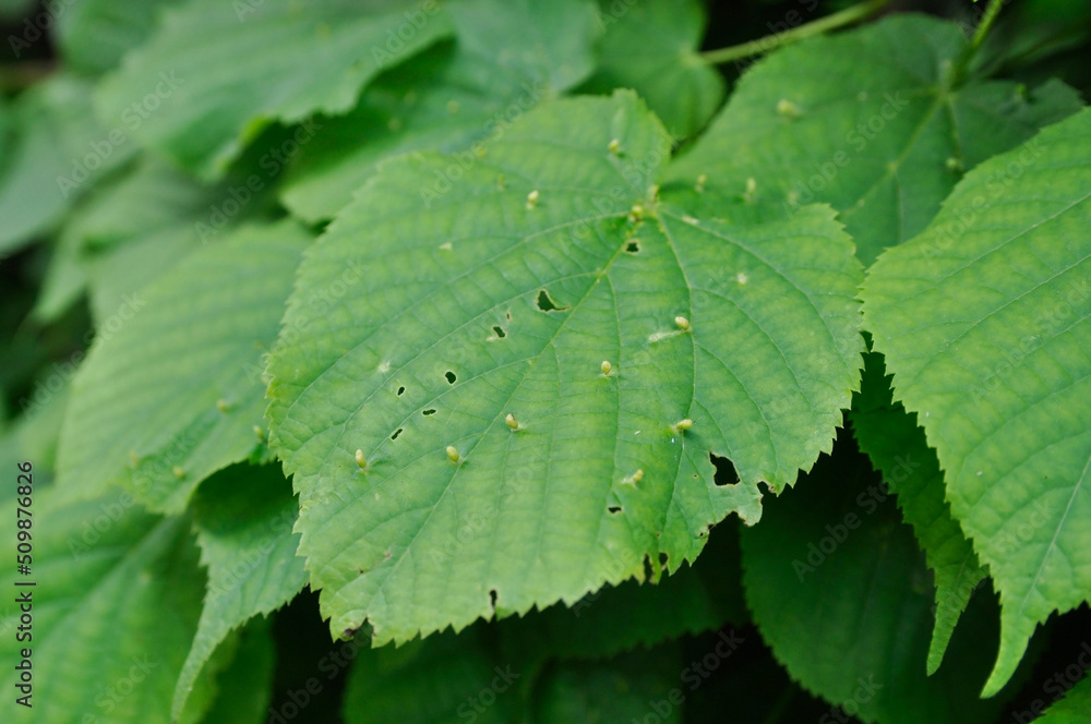 Lime gall caused by the gall mite (Eriophyes tiliae tiliae) on the leaves of the common linden.