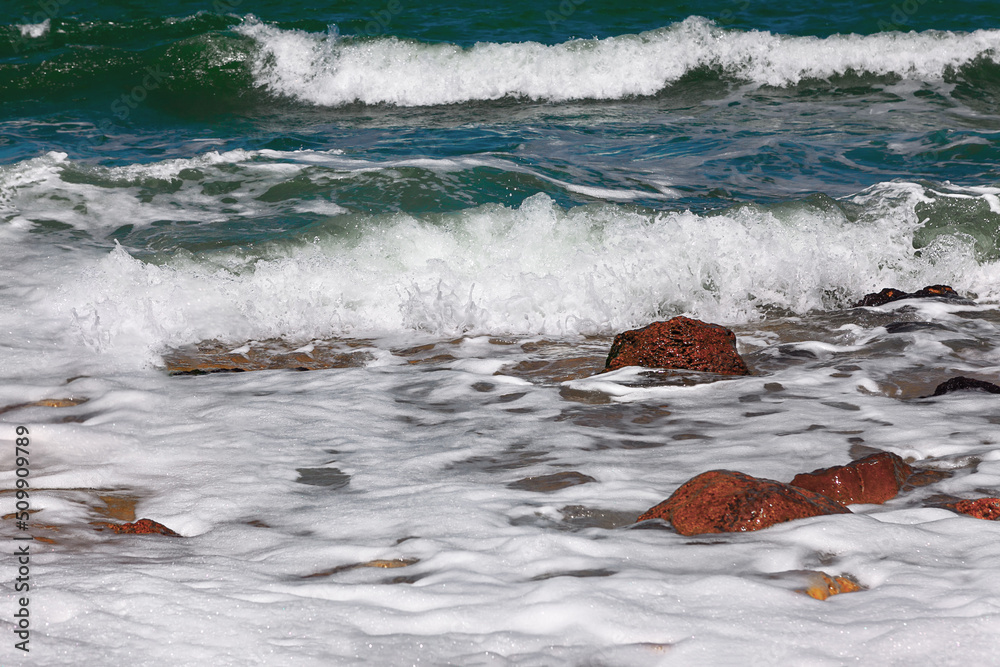 Sea waves with foam beating the rocks