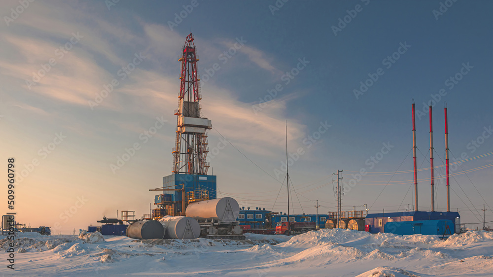 A general view of a drilling rig for drilling wells at an oil and gas field in the Arctic region. Winter. Day. Drilling equipment and technical infrastructure