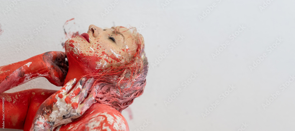 panorama banner portrait of sensual lustful woman, head thrown backwards, bodypainting art