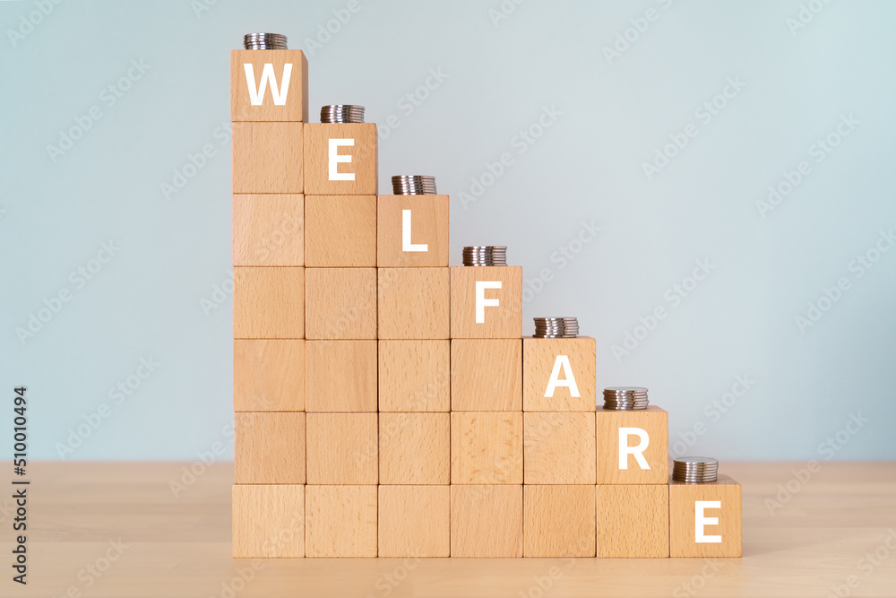 福祉のイメージ|「WELFARE」と書かれたブロックとコイン