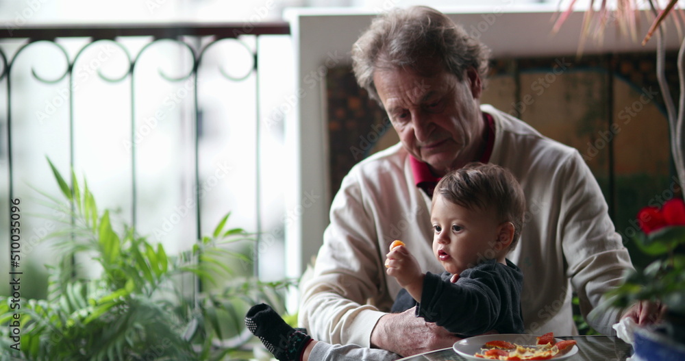 Casual grand-father holding baby infant at balcony. Candid grand-parent with toddler grand-son