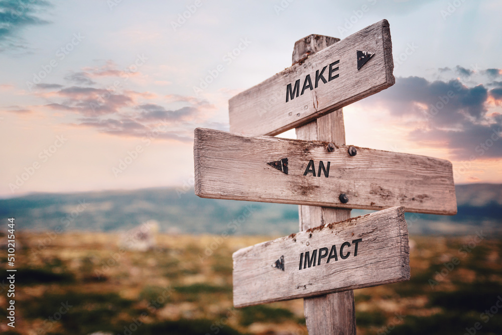 make an impact text quote caption on wooden signpost outdoors in nature. Stock sign words theme.