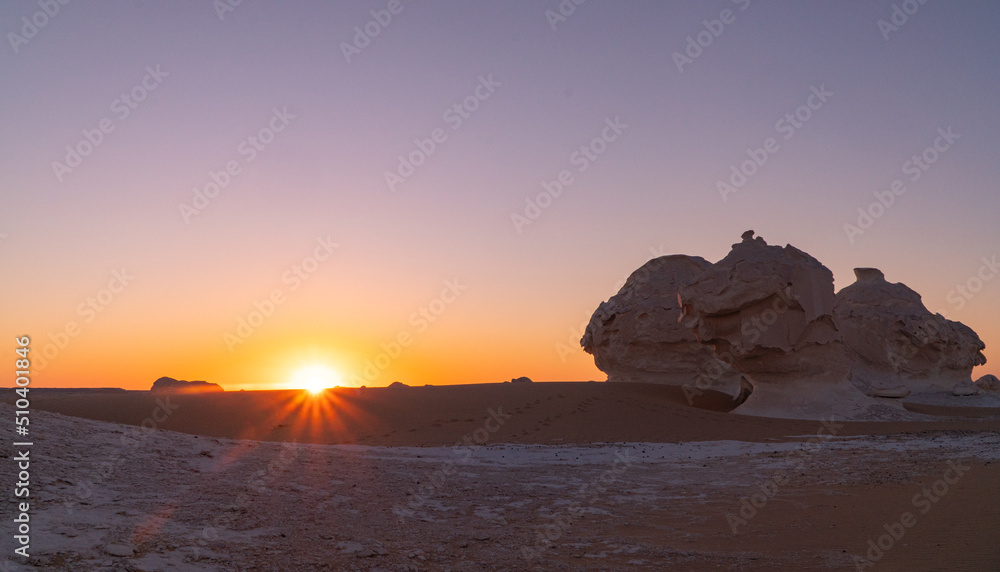 sunrise in the white desert with the sun coming up behind the rock formations in Egypt
