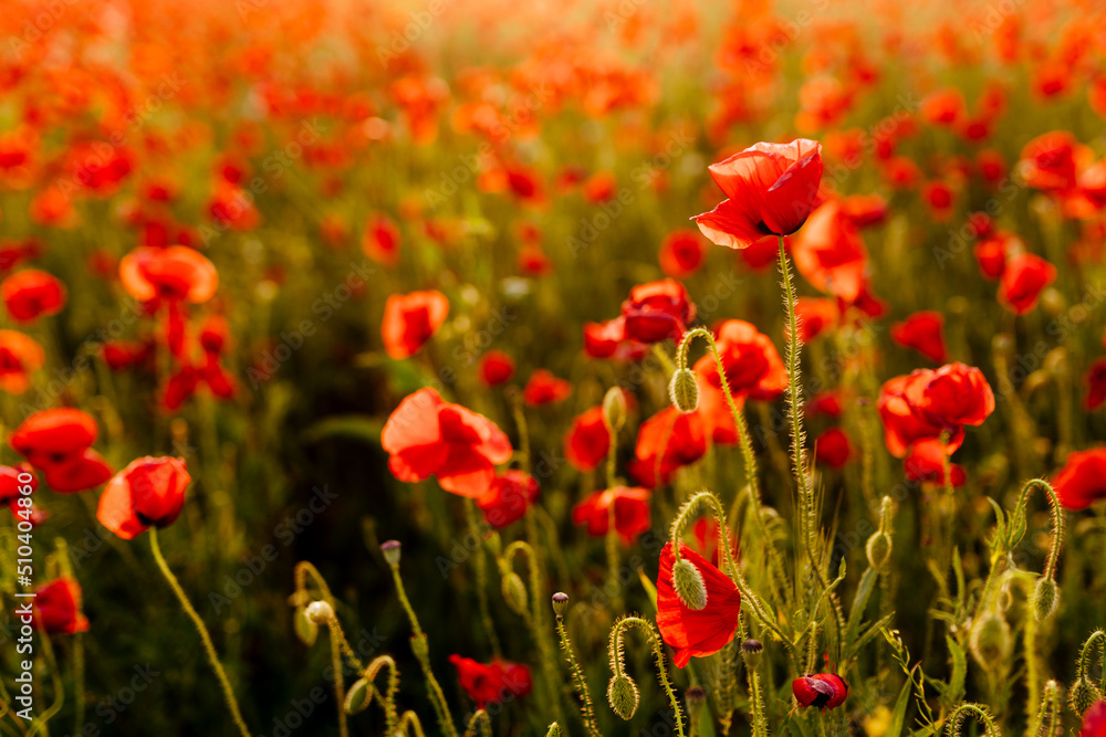 Beautiful Sunset Over Poppy Field in the summer