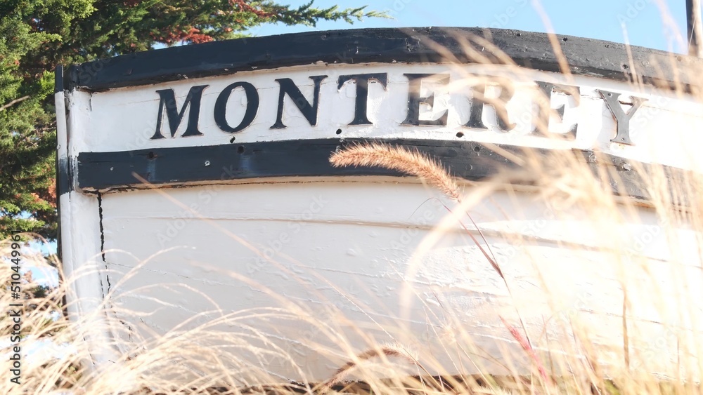 Monterey sign on white wooden boat stern, fisherman nautical vessel stem, bow or rostrum near Cannery Row and Bay Aquarium. Coniferous pine cypress tree. Historic capital, tourist city, California USA