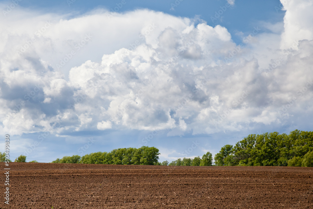Plowed field and blue sky. agriculture plowed field and blue sky with clouds. Furrows for growing potatoes.