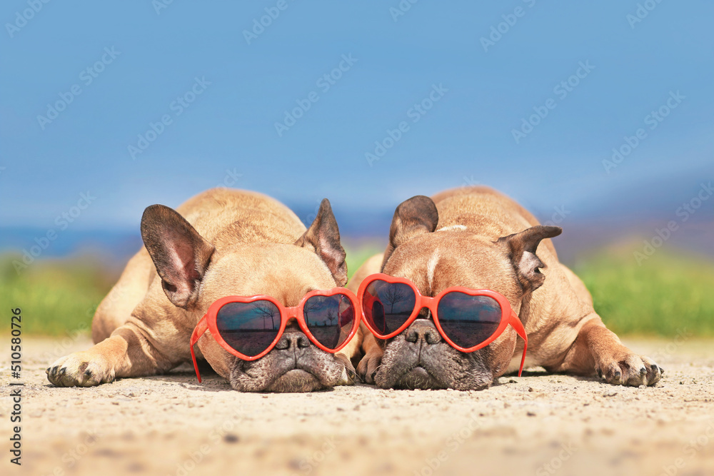Pair of French Bulldog dogs wearing red heart shaped sunglasses in summer