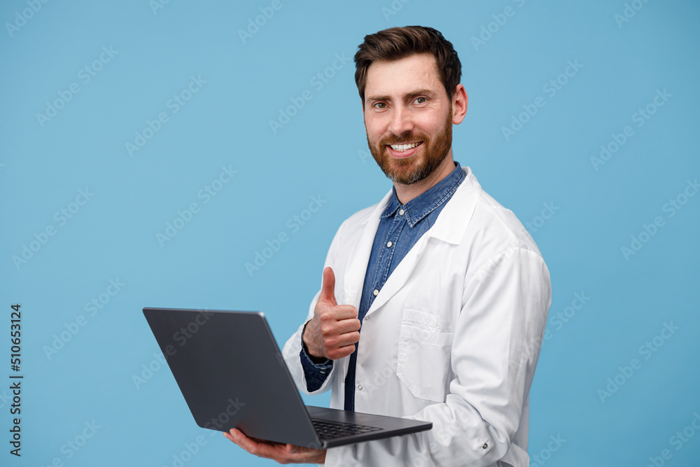 Chearfull medical specialist in a white coat holding laptop and showing thumbs up