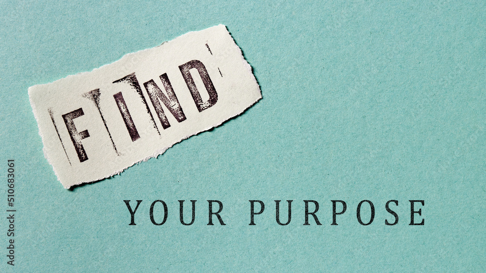 Find your purpose words on paper. Stamp font. Meaningful life concept.